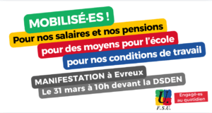 Le 31 mars, toutes et tous mobilisé.es ! 2026-03-26T09:11:45+01:0026 mars 2026|Catégories : Non classé| Partagez cet article ! FacebookXWhatsAppTelegramEmail Articles similaires Tous et toutes en grève le 5 décembre Tous et toutes en grève le 5 décembre 20 novembre 2024 Bulletin FSU 27 de rentrée – Bonne lecture Bulletin FSU 27 de rentrée – Bonne lecture 11 septembre 2023 stage intersyndical « discrimination des femmes au travail et « Violences sexistes et sexuelles » (avec les fédérations syndicales CGT 27 et Solidaires 27) le mardi 28 février 2023 stage intersyndical « discrimination des femmes au travail et « Violences sexistes et sexuelles » (avec les fédérations syndicales CGT 27 et Solidaires 27) le mardi 28 février 2023 17 janvier 2023 L’extrême droite battue, continuons nos combats pour consolider la démocratie et agir pour le progrès social. L’extrême droite battue, continuons nos combats pour consolider la démocratie et agir pour le progrès social. 24 avril 2022 10ème congrès de la FSU à Metz du 31 janvier au 4 février 10ème congrès de la FSU à Metz du 31 janvier au 4 février 1 février 2022